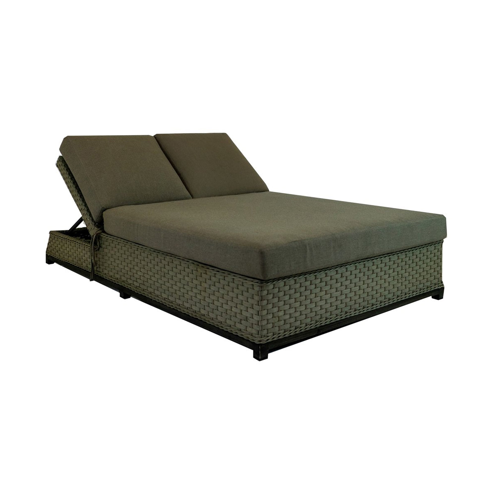 The Moorea Armless Double Chaise is a luxurious place to relax in the sun. Two individual, adjustable headrests make it an ideal chaise for two people. There is room to be separate or room to snuggle and snooze. This armless version allows for easier access all around. Like the rest of the collection, the broader flat weave of this wicker is set off by faux teak accents and contrasting, corded-edge details. The Moorea Collection is fancy without being fussy.