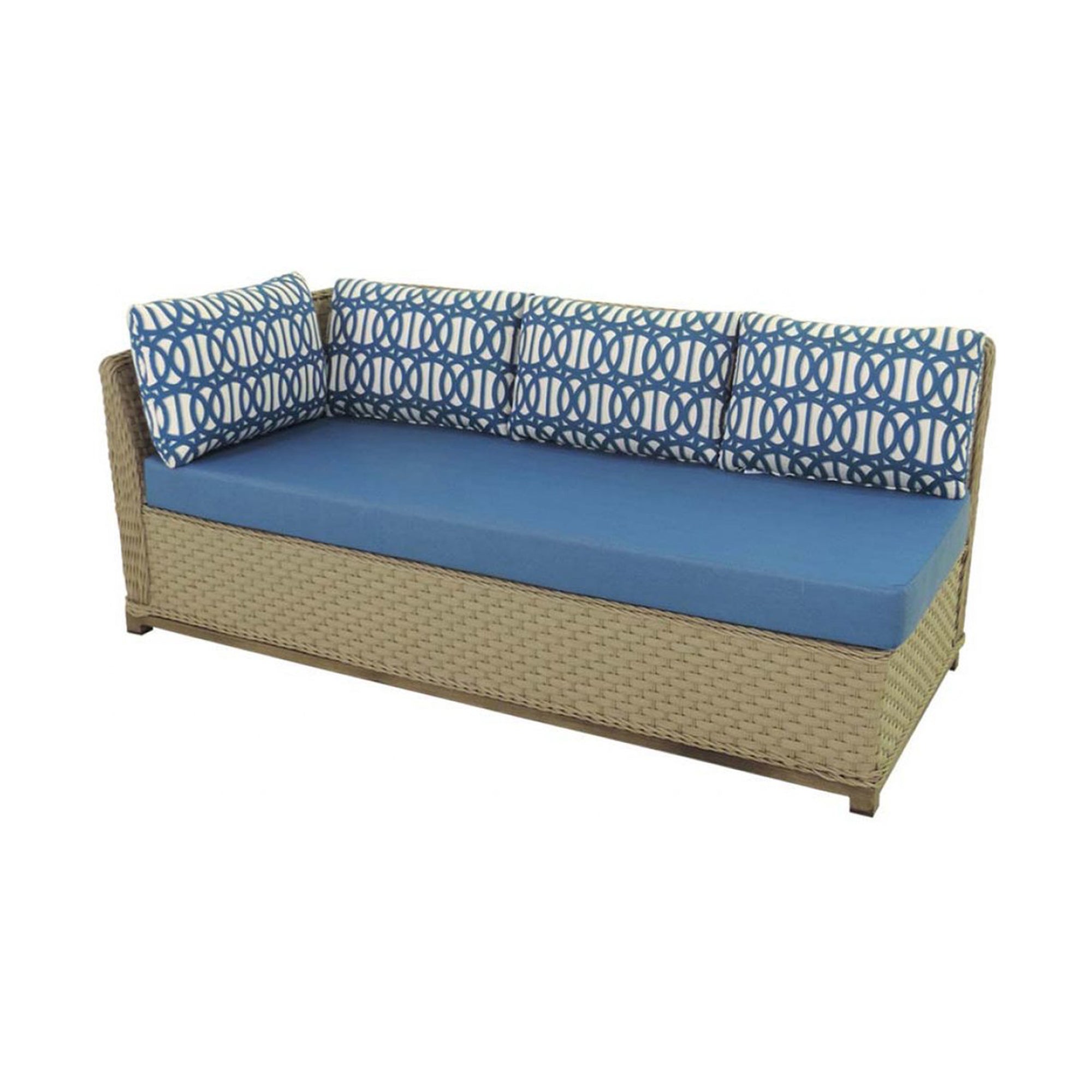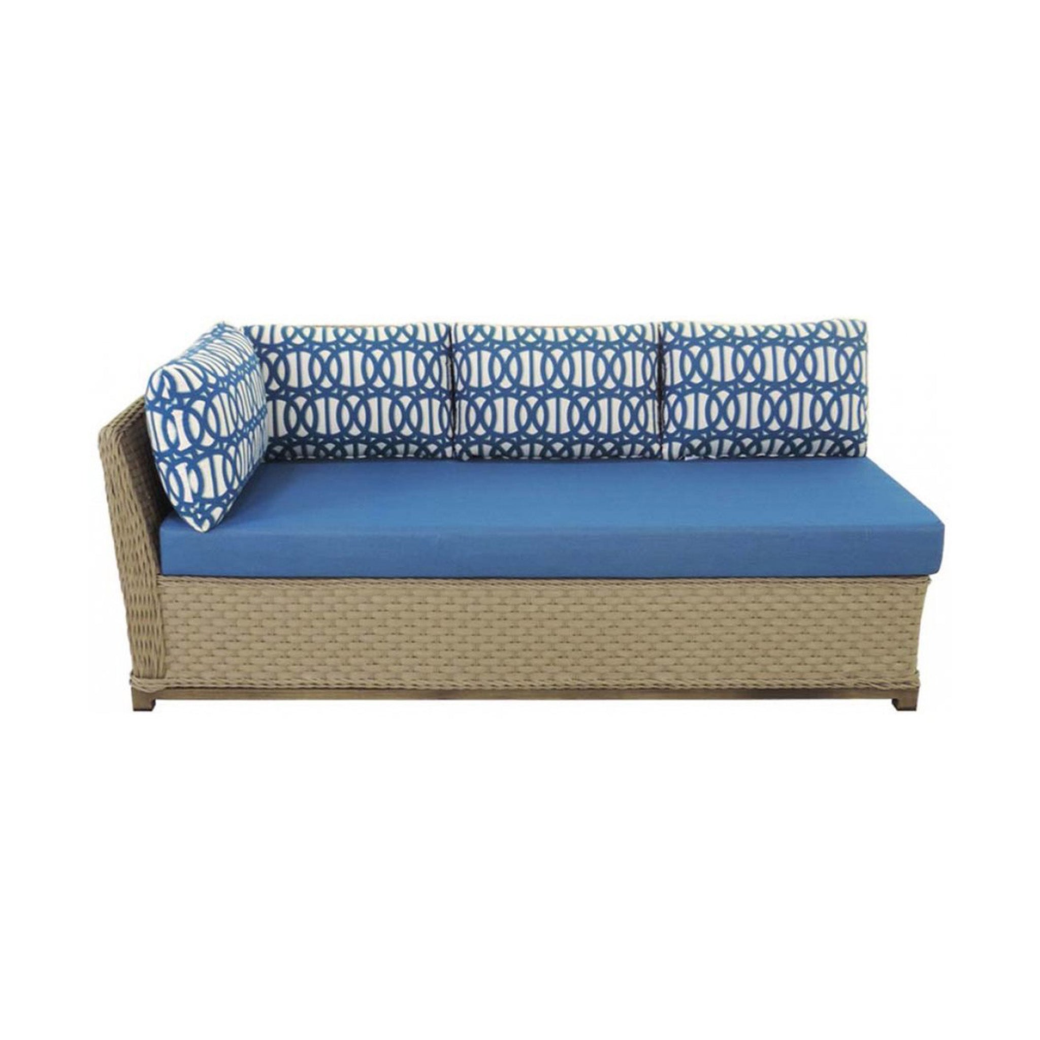 The Moorea LAF Sofa may be combined with Moorea Sofa or RAF Settee to make a striking sectional piece. The elegant lines of the frame construction maximize seating space and define sitting areas with grace and style. This LAF Sofa comes standard with pillow backs, as shown above, but it may be customized to your liking. The broader flatweave of this wicker is set off by faux teak accents and contrasting, corded-edge details. The Moorea Collection is fancy without being fussy.