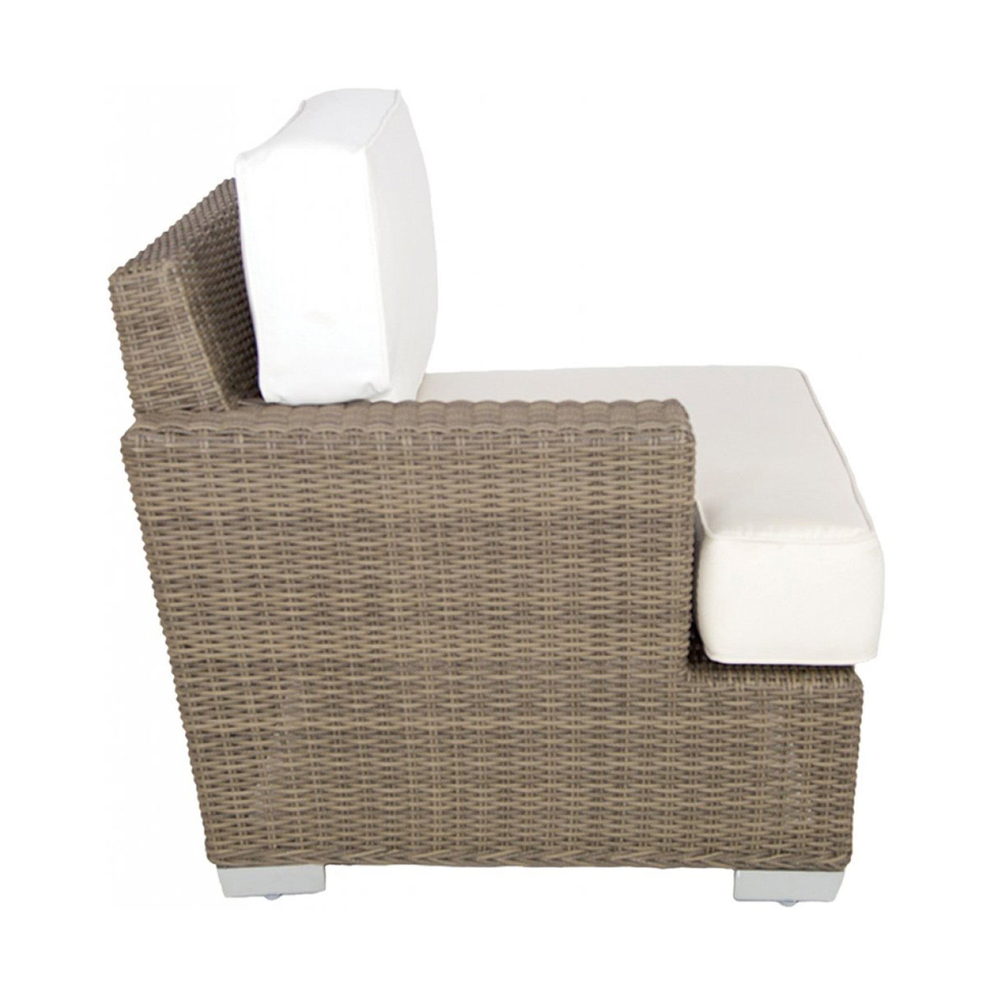 The Palisades LAF Chair combines with a Corner Chair, Armless and RAF Chair to create a spacious sectional. Throw in another Armless Chair to create an extra long sectional. This transitional piece utilizes sophisticated lines with a lighter stain that can blend easily with other finishes in a room. The half-round weave is traditional, while its broad, low arms are more modern. These functional arms provide perfect perches for drinks or snacks. Plush cushions round out this sectional with comfort and softness.